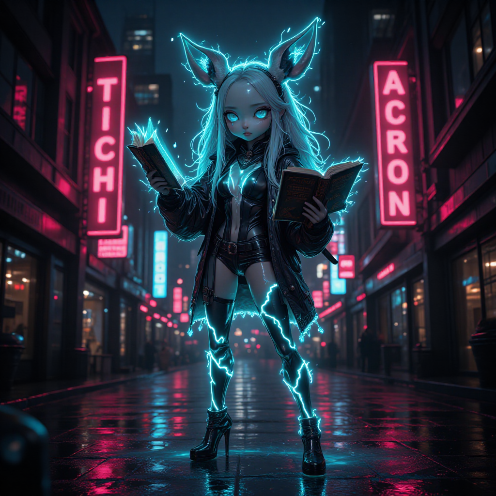 пушистый зверек фурри,в стиле фентези, большие глаза, антропоморфный , стоит на двух ногах во весь рост, в латексном костюме,пушистый розового цвета, в руках держит мобильный. идет дождь, <lora:Vibrant_Chrome_2:2> VibrantChrome style. <lora:epoxy_skull:0.94> epoxy_skull, style #ai #art #zit #flux